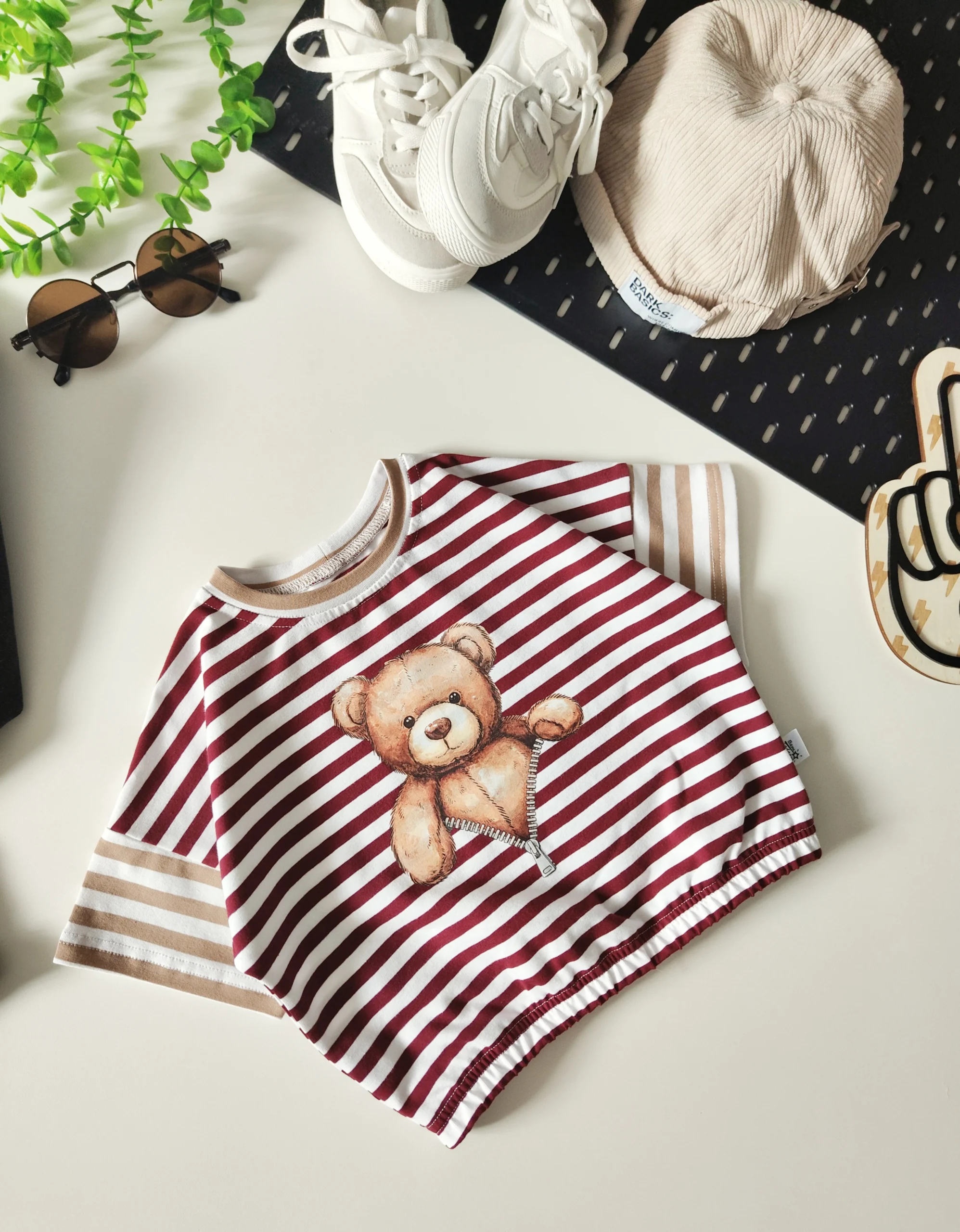 T-shirt PASKI BORDOWO-BEŻOWO-BIAŁE „Misiaczek” >od ręki 80/86<