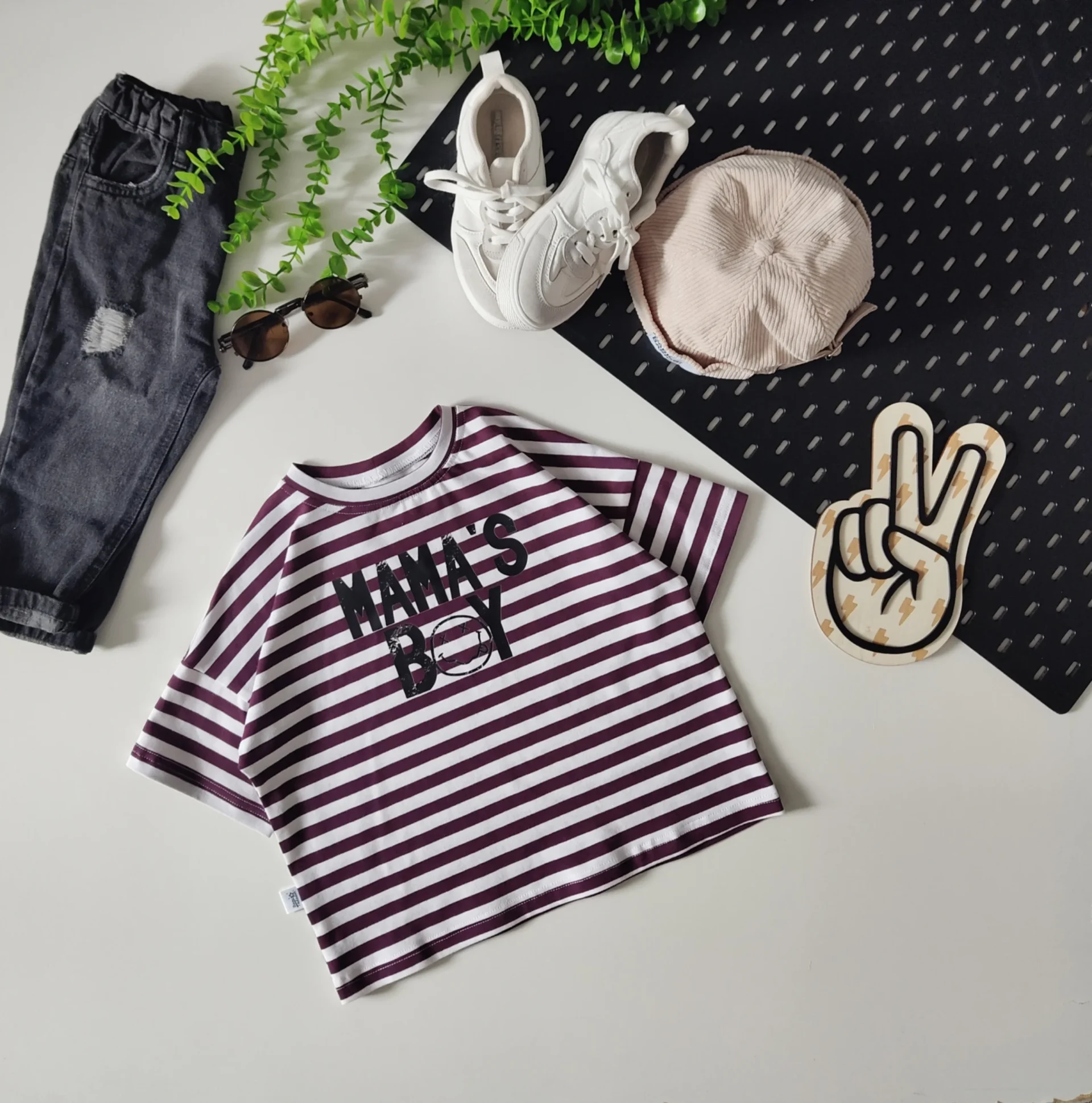 T-shirt PASKI FIOLETOWO-BIAŁE „Mama’s boy” >od ręki 104/110<
