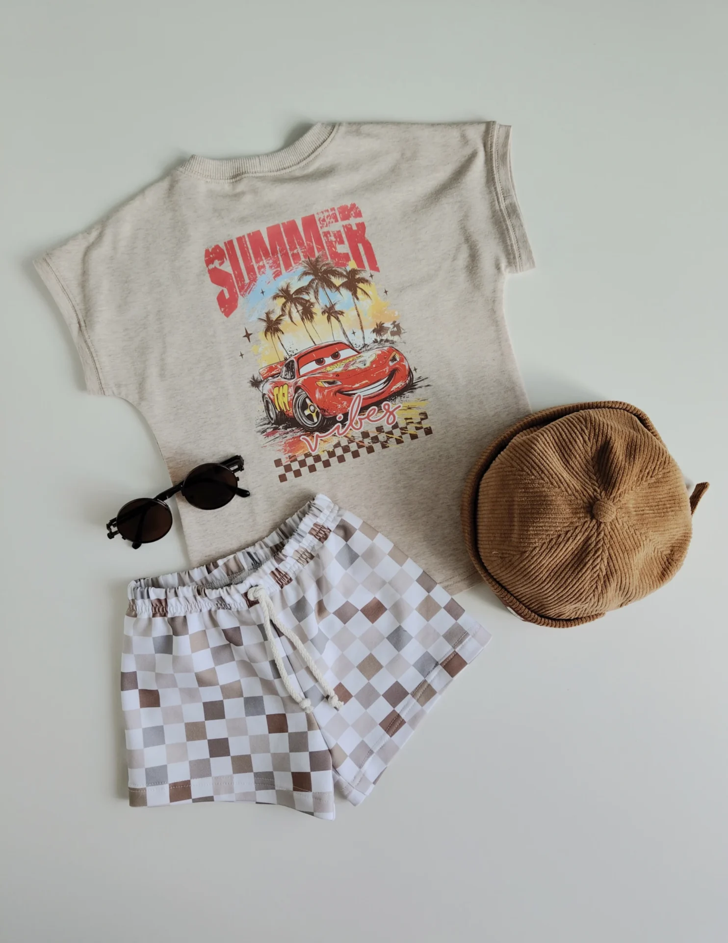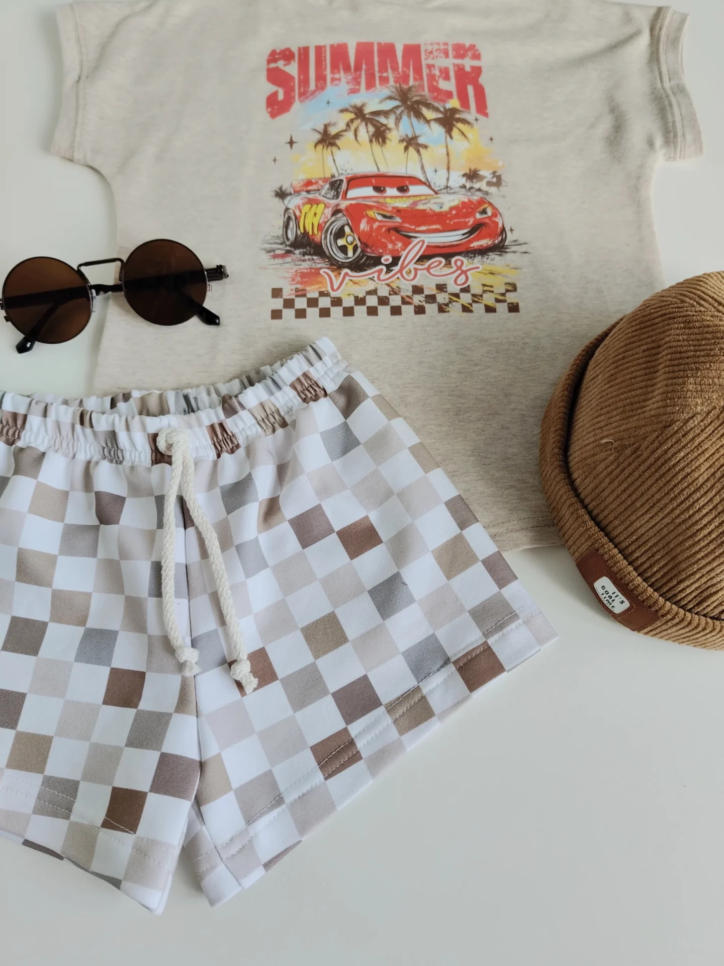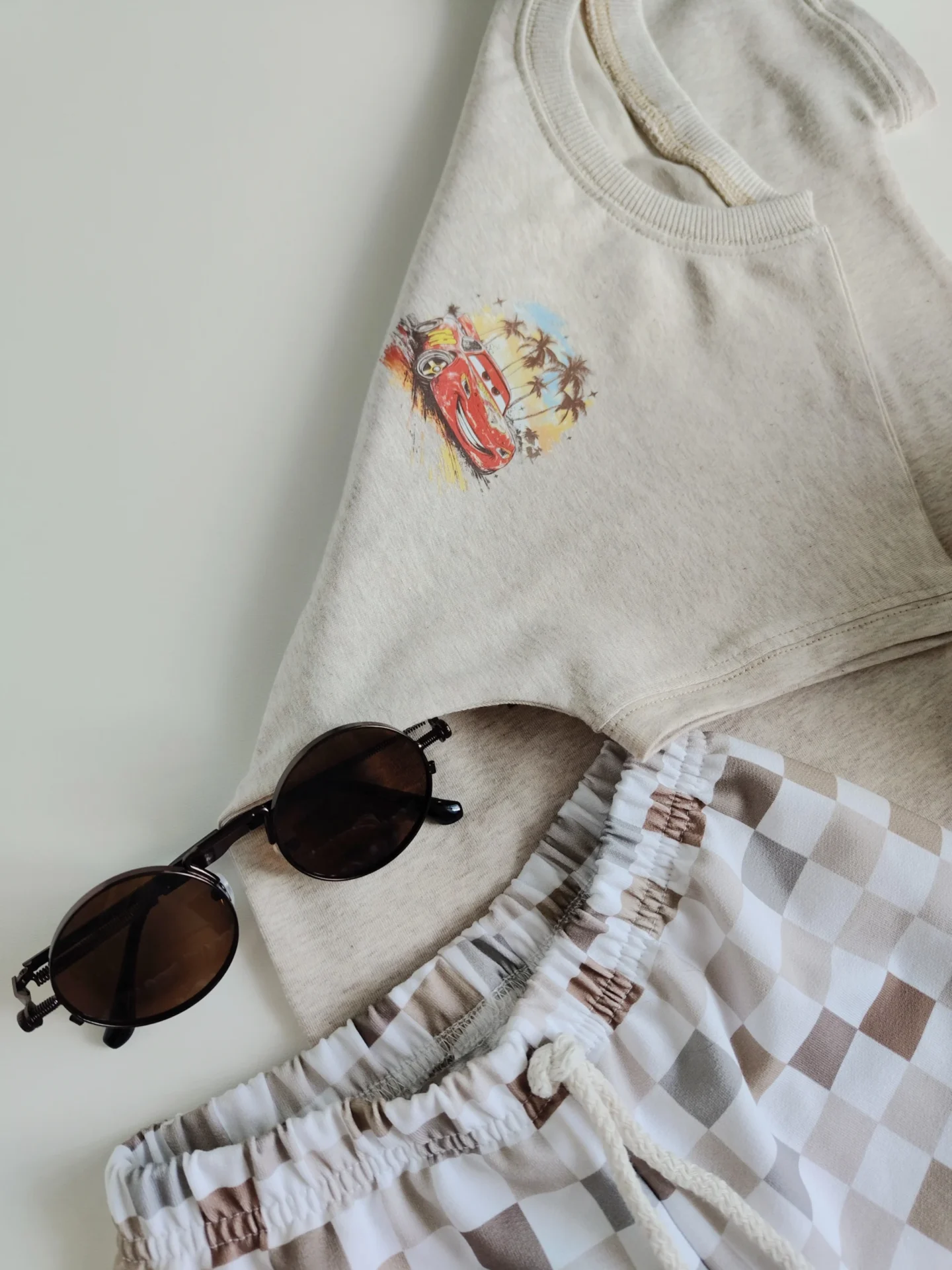 Zestaw w odcieniach beżu- koszulka w kolorze owsianki, z wydłużonym tyłem i dwustronną grafiką oraz luźne, krótkie szorciki we wzór szachownicy w różnych odcieniach brązu i beżu.